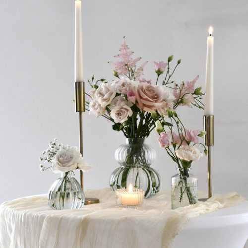 Tischdeko: pro Tisch 3 Vasen in versch. Größen inkl. Blumen, 3 Kerzenhalter, 3 Teelichtgläser, Tischband